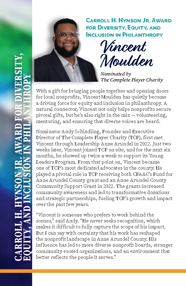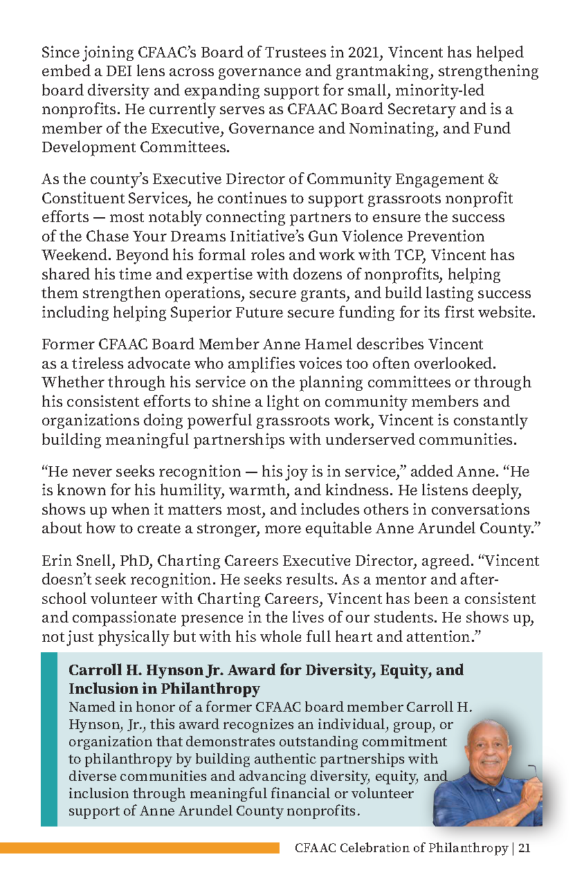 I had the honor of accepting the Carroll H. Hynson, Jr. Award for Diversity, Equity, and Inclusion in Philanthropy. Standing on that stage, I felt humbled to receive an award named after a true pillar in our community and to be recognized for