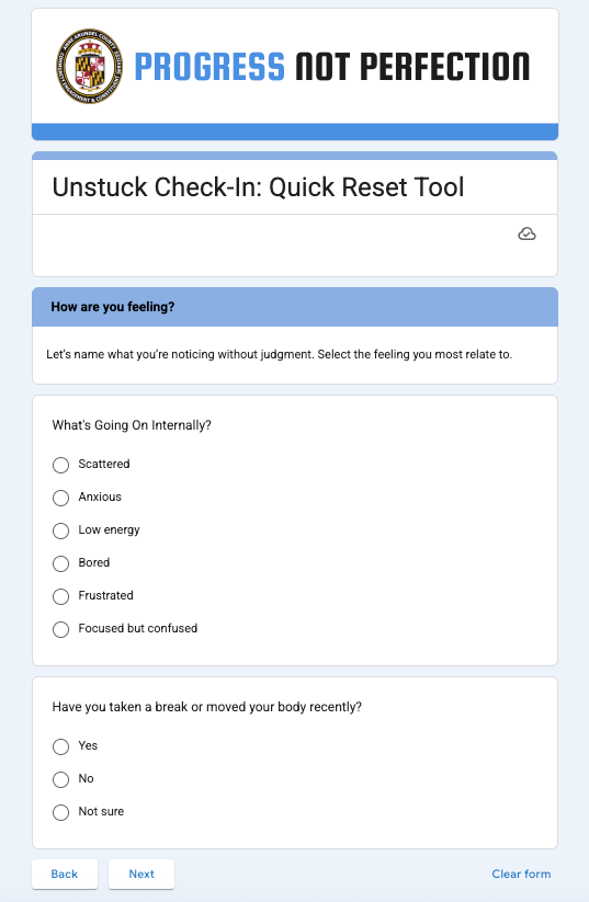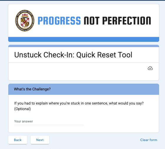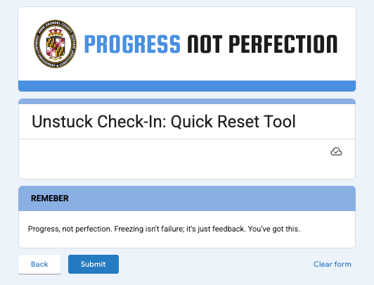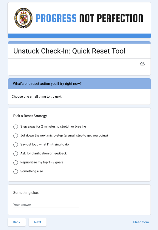 It is a short form that the intern completes when he notices he has hit a wall. It asks him to reflect on what is hard about the task, what is going on internally, and what kind of reset might help. He rates his clarity and confidence, and once a week, we review those stuck moments together during our check-in and development time. Even the form's color was intentional, as blue is said to provide clarity and calm.